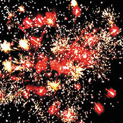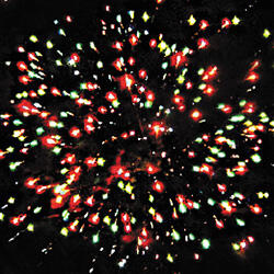 Цветные звезды с пышными хвостами, мерцание и облако треска. Разноцветные мерцающие сферы. Трещащий разрыв. Сфера золотых хвостов.