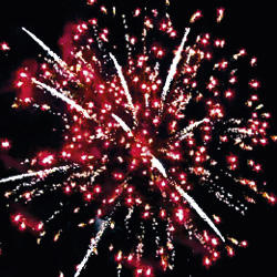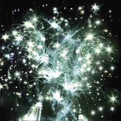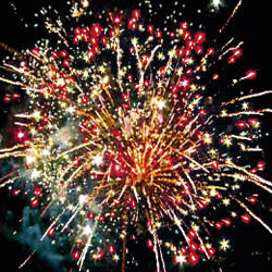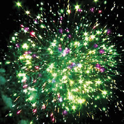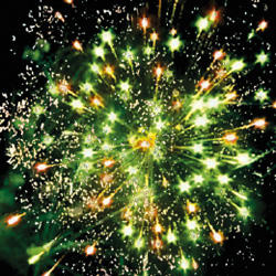 Цветные мерцающие сферы. Золотые и разноцветные звезды с пышными хвостами. Серебряные разрывы. Облако треска. Мерцающие серебряные букеты.