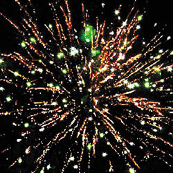 Цветные звезды с пышными хвостами и мерцание. Множество золотых и серебряных ниспадающих нитей и облако треска.