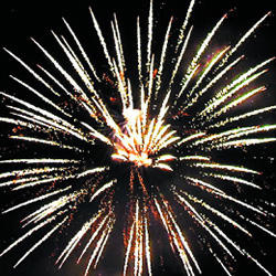 Выстреливает подряд: Сфера золотых хвостов с переходом в белые звезды (белая хризантема). Множество серебряных ниспадающих нитей (парча) и облако трещащих разрывов (трещащий дождь). Выстреливает подряд: Красные и зеленые звезды с хвостами (волна) и облако трещащих разрывов (трещащий дождь). Свистящие змейки. Красно-синяя сфера (пион). Мерцающие золотые хвосты (мерцающая ива), зеленое мерцание и красные звезды.