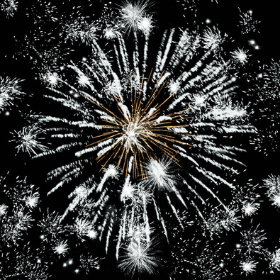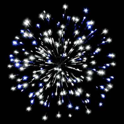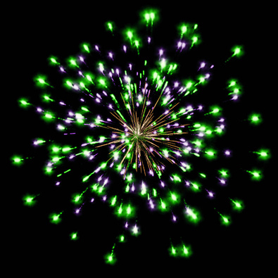 Разноцветные кометы разрываются сферами из цветных мерцающих огней, серебряных искристых форсов и множества серебряных трещащих огней.