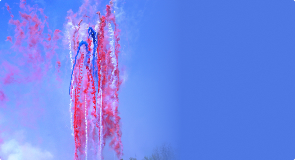 Потоки зеленого и красного дыма. На парашютах спускаются разноцветные ленточки и цветные дымы. Свистящие элементы, сферы с громкими хлопками, серебряные трещащие звезды. В концовке веер из трещащих звезд и цветных дымов.
